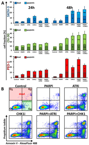 ATRi/CHK1i monotherapy and combination treatment caused phosphatidylserine externalization. (A) Percentage of apoptotic and dead SKOV-3, PEO-1 and OV-90 cells after 24 and 48 h treatment with PARPi (4 µM), ATRi (4 µM) or CHK1i (4 µM) alone or in combination. Data are presented as mean ± SD of 3 independent experiments. * indicates statistically significant differences between samples incubated with the compound compared with control cells (p < 0.05); + indicates statistically significant differences between samples incubated with PARPi alone and the combination treatments (PARPi:ATRi; PARPi:CHK1i) (p < 0.05). (B) Representative dot plots showing induction of apoptosis and fraction of dead PEO-1 cells after 48 h treatment with PARPi (4 µM), ATRi (4 µM) or CHK1i (4 µM) alone and in combination. Data for SKOV-3 and OV-90 cells are shown in Supplementary Figure S2. Individual samples are presented as data points. The population of apoptotic cells was calculated according to the presented gating strategy.