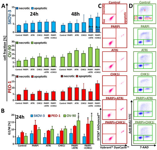 Treatment with PARPi in combination with ATR/CHK1 pathway inhibitors bypasses the cell cycle checkpoint due to an early signal of cell death. (A) Percentage of apoptotic and necrotic SKOV-3, PEO-1 and OV-90 cells after 24 and 48 h treatment with PARPi (4 µM), ATRi (4 µM) or CHK1i (4 µM) alone or in combination; (B) G2/M phase distribution of PEO-1 treated for 24 h. Data are presented as mean ± SD of 3 independent experiments. * p < 0.05 vs. control cells. * indicates statistically significant differences between samples incubated with the compound compared with control cells (p < 0.05); + indicates statistically significant differences between samples incubated with PARPi alone and the combination treatments (PARPi:ATRi; PARPi:CHK1i) (p < 0.05); # denotes statistically significant differences between samples incubated with ATRi or CHKi alone and their corresponding combination treatments (PARPi:ATRi; PARPi:CHK1i) (p < 0.05); (C) Representative dot plots showing induction of apoptosis and necrosis in PEO-1 cells after 48 h treatment with PARPi (4 µM), ATRi (4 µM) or CHK1i (4 µM) alone and in combination. Data for SKOV-3 and OV-90 cells are shown in Supplementary Figure S6. Individual samples are presented as data points. The population of apoptotic cells was calculated according to the presented gating strategy; (D) Representative dot plots demonstrating the distribution of cell cycle phases in PEO-1 cells after 24 h treatment alone and in combination. Representative dot plots for SKOV-3 and OV-90 cells are shown in Supplementary Figure S7. Individual samples are presented as data points. The population of cells in each phase of the cell cycle was calculated according to the presented gating strategy.