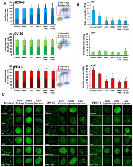 The effects of PARPi, ATRi or CHK1i alone and in combination on the S-phase of the cell cycle. (A) BrdU-positive heterochromatin labelling (labelling index) was used to examine the S-phase of the cell cycle after 24 h treatment with PARPi (4 µM), ATRi (4 µM) or CHK1i (4 µM) alone and in combination. The cells were gated into early mid or mid-late S-phase populations based on DNA content; (B) Incorporation of BrdU. Data are presented as mean ± SD of 3 independent experiments. * indicates statistically significant differences between samples incubated with the compound compared with control cells (p < 0.05), + indicates statistically significant differences between samples incubated with PARPi alone and the combination treatments (PARPi:ATRi; PARPi:CHK1i) (p < 0.05); (C) Fluorescence images of EdU incorporation. Based on differences in the pattern of DNA replication (EdU), cells were identified as progressing through early, mid, and late stages of the S-phase (magnification 40×, scale bar 20 µm). Enlarged fragments of photos are presented in the columns on the right side of each individual cell line panel.