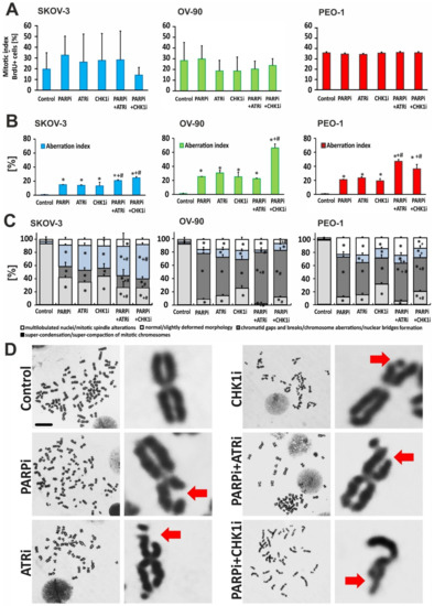 PARPi treatment in combination with CHKi and ATRi causes chromosome aberrations. DNA damage effects were measured by metaphase chromosome spread. (A) The mitotic index was calculated as the percent ratio between the number of dividing cells and the entire cell population. The quantification was determined by BrdU incorporation; (B) Aberration index (M-phase aberrant cells) was calculated as the percent ratio between the number of cells showing chromosome aberrations and all mitotic cells; (C) Nuclear phenotypes in PEO-1/OV-90/SKOV-3 cells were determined by Giemsa and by counterstaining with DAPI (0.1 mg/mL). Types of chromosomal aberrations were counted under the microscope (Zeiss, Jena, Germany). * indicates statistically significant differences between samples incubated with the compound compared with control cells (p < 0.05); + indicates statistically significant differences between samples incubated with PARPi and the corresponding combination treatments (PARPi:ATRi; PARPi:CHK1i) (p < 0.05); # denotes statistically significant differences between samples incubated with ATRi or CHKi and their corresponding combination treatments (PARPi:ATRi; PARPi:CHK1i) (p < 0.05); (D) Replication stress inhibitors synergize with PARPi and cause chromosomal aberrations in PEO-1 cells. Representative images of OV-90 and SKOV-3 cells are shown in Supplementary Figure S8. Red arrows show damaged chromosomes. Stained slides were analyzed using a 100× objective (scale bar 20 µm) and a Nikon ECLIPSE E600W microscope (Nikon, Warsaw, Poland).