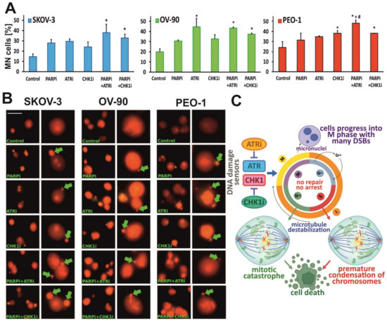 PARPi treatment in combination with ATRi/CHK1i elevates the number of cells with MN. (A) Number of cells with MN in OV-90, SKOV-3 and PEO-1 cell lines after 24 h treatment with PARPi (4 µM), ATRi (4 µM) or CHK1i (4 µM) alone and in combination. * indicates statistically significant differences between samples incubated with the compound compared with control cells (p < 0.05); + indicates statistically significant differences between samples incubated with PARPi alone and the combination treatments (PARPi:ATRi; PARPi:CHK1i) (p < 0.05); # denotes statistically significant differences between samples incubated with ATRi or CHKi and their corresponding combination treatments (PARPi:ATRi; PARPi:CHK1i) (p < 0.05); (B) Morphological changes after 24 h treatment with compounds related to the formation of MN. Extranuclear bodies of the damaged part of chromosome are marked by green arrows. Enlarged fragments of photos are presented in the columns on the right side of each individual cell line panel. The cells were stained with acridine orange and visualized by fluorescence microscopy (Olympus IX70, Japan; scale bar 50 µm, magnification 400×); (C) Ovarian cancer cells with ATR/CHK1 deficiencies progress to M phase without G2/M checkpoint arrest. ATRi/CHK1i induces premature chromosome condensation (PCC) by bypassing the internal S-phase checkpoint mechanism. The failure of G2/M checkpoint arrest causes severe DNA fragmentation such as unrepaired double-strand breaks (DSBs) during M phase, which result in multiple MN. Cells with multiple nuclear fragmentations undergoing MC.