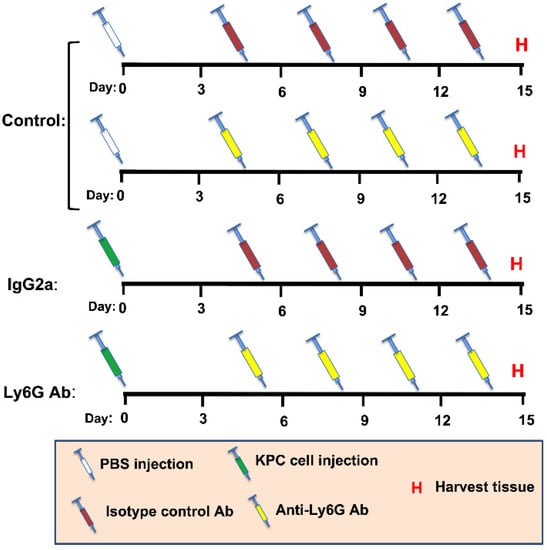 It has been shown that 1A8 is a Ly6G-specific monoclonal antibody produced in the rat that is well tolerated and routinely used to deplete Ly6G+ cells in mice [,,]. In this study, one group of tumor-bearing mice received 10 mg/kg of 1A8 antibody (Ly6G) by IP injection. A second group of tumor-bearing mice were treated with an equal amount of rat IgG2a isotype control antibody 2A3 (Isotype). Non-tumor-bearing sham control mice also received either the isotype control antibody or Ly6G antibody. Because no significant treatment effects were seen in the control (non-tumor-bearing) groups, the data from these mice were collapsed into a single group, which is hereafter called the control group. Antibody injections were undertaken at 5, 8, 11, and 14 days after cell injection or sham procedures. Antibodies (1A8 and 2A3) were purchased from BioXcell (West Lebanon, NH, USA). A diagram illustrating the study design is presented in Figure 1.