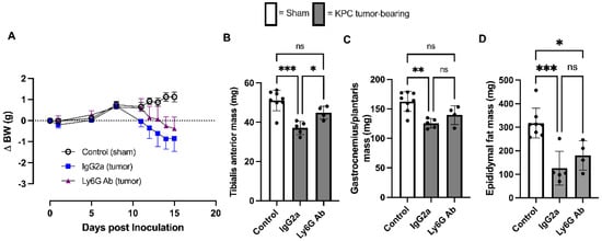 Effect of anti-Ly6G antibody on body weight and skeletal muscle mass in the orthotopic KPC model of cancer cachexia. (A) Changes in body weight (mean and standard deviation) of Sham mice (Control; n = 8) and KPC tumor-bearing groups treated with either isotype control (IgG2a; n = 5) or anti-Ly6G antibody (n = 5) throughout study duration. (B) Tibialis anterior (C) and gastrocnemius/plantaris and (D) epididymal fat pad mass from control mice and KPC mice treated with isotype control or anti-Ly6G antibody at experimental endpoint. Open bars = control group; grey bars = tumor bearing. * p < 0.05; ** p < 0.01; *** p < 0.001; ns = not significant (p > 0.05).