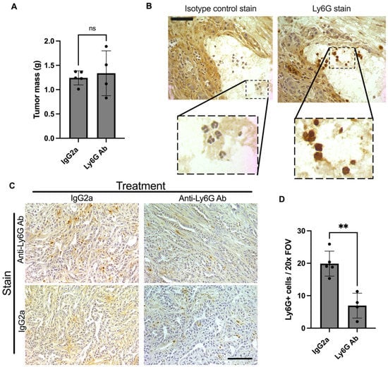Effect of Ly6G antibody treatment on tumor. Orthotopic KPC tumor-bearing mice were treated with an anti-Ly6G antibody (1A8) or isotype control (2A3) every 3 days starting at 5 days post inoculation. (A) Endpoint tumor mass was not different between groups (ns = not significant). (B) Serial sections were also stained using the isotype control antibody (2A3) in parallel. This shows a high magnification (40×) view of serial sections. Comparing the stains shows that cells with characteristic multilobed nuclei pick up the Ly6G stain. Scale bar = 50 μm. (C) Representative tumor sections stained with anti-Ly6G antibody (1A8) to detect Ly6G+ cells in the tumor. While KPC tumors from isotype control-treated mice did not show positive immunoreactivity in the absence of the Ly6G antibody, KPC tumors from mice treated with anti-Ly6G treatment showed some cells with positive immunoreactivity. These cells likely reflect Ly6G+ cells labeled, but not yet depleted, by the 1A8 antibody in vivo (during treatment). Images were taken at 20× magnification. Scale bar = 100 µm. (D) KPC tumors from isotype control-treated mice (n = 5) had significantly more Ly6G positive cells per field of view (FOV) than those from anti-Ly6G antibody-treated mice (** p < 0.001; n = 4).