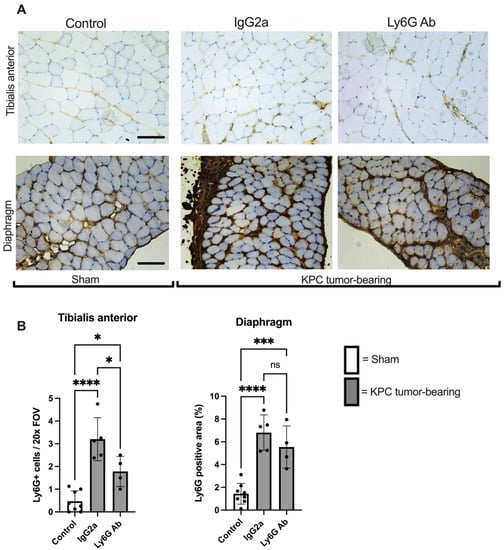Increased presence of Ly6G+ cells in limb muscles of KPC mice is blunted with anti-Ly6G Ab treatment. (A) Representative cross-sectional images of tibialis anterior and diaphragm muscles from Sham (Control; n = 8) and KPC mice treated with either isotype control antibody (n = 5) or anti-Ly6G antibody (n = 4) were stained for the Ly6G antigen. Images were analyzed and are quantified in panel (B). Four randomly selected 20× images were analyzed for each mouse of each group. Open bars = Sham (Control). Grey bars = KPC. * p < 0.05, *** p < 0.001, **** p < 0.001, ns = not significant. Scale bars = 100 µm.