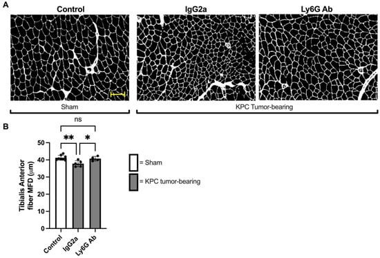 The depletion of Ly6G+ cells protects against orthotopic KPC-induced muscle fiber atrophy. (A) Representative images of TA muscle cross-sections from Sham and KPC tumor-bearing mice stained with WGA to outline muscle fiber borders. Scale bar = 100 μm. (B) Average TA muscle fiber size, based on quantification of minimum Feret’s diameter (MFD). All intact muscle fibers of the TA muscle were measured. Control: n = 8; IgG2a n = 5; Ly6G Ab: n = 4. * = p < 0.05; ** p < 0.01; ns = not significant (p > 0.05).