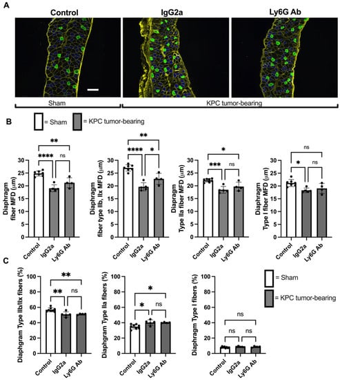 We also measured muscle fiber size in the diaphragm, since this muscle similarly undergoes significant wasting in tumor-bearing hosts []. Diaphragm muscle fiber size was significantly smaller in both Isotype-treated (MFD: 19.1 ± 1.4 μm) and anti-Ly6G-treated (MFD: 21.2 ± 1.9 μm) KPC groups compared to control mice (MFD: 26.4 ± 4.4 μm, Figure 6B). Although diaphragm fiber size was numerically larger in anti-Ly6G-treated compared to Isotype-treated KPC mice, this difference did not reach statistical significance (p = 0.08, Figure 6B). However, because the diaphragm is heterogeneous in its fiber type distribution, we also considered the potential impact of anti-Ly6G+ treatment on fiber type-specific atrophy. Interestingly, although we found a similar degree of atrophy in type I and type IIa diaphragm fibers in both KPC tumor-bearing groups, type IIx/IIb fibers showed significantly less atrophy in KPC mice treated with anti-Ly6G antibody (p = 0.03, Figure 6B). This indicates that anti-Ly6G treatment in KPC mice was protective against diaphragm muscle fiber atrophy specifically in IIx and IIb fibers.