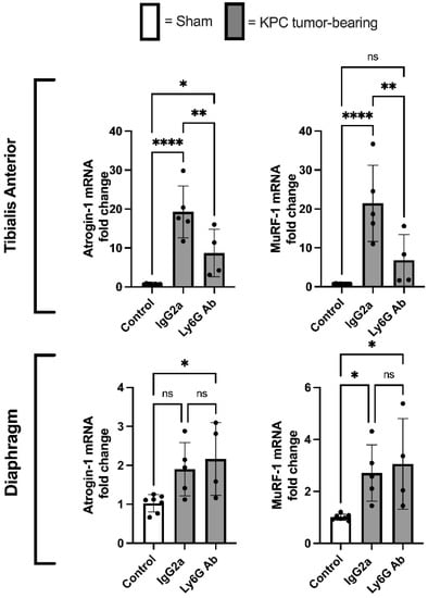 The depletion of Ly6G+ cells inhibits the KPC-induced upregulation of the muscle-specific E3 ligases, atrogin1/Fbxo32 and MuRF1/Trim63. RT-qPCR-based measurement of atrogin-1/Fbxo32 and MuRF1/Trim63 mRNA in TA and diaphragm muscles of Sham mice (n = 8), and KPC treated with either isotype control (IgG2a; n = 5) or anti-Ly6G antibody (n = 4). Gene expression data are normalized to GAPDH as a reference gene. PCR reactions were run in triplicate and the average Ct value was used for analysis. * p < 0.05; ** p < 0.01; **** p < 0.0001; ns = not significant (p > 0.05).