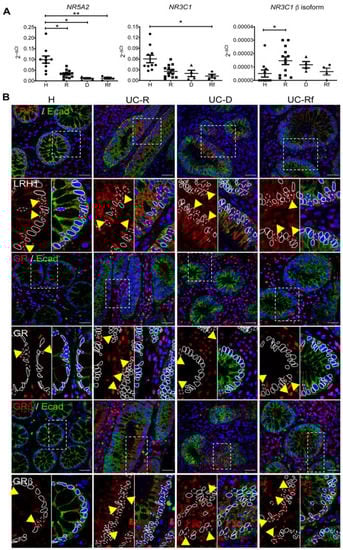LRH-1 and GRβ are upregulated in intestinal mucosa from patients with impaired GC response. (A) Transcript levels (relative to PPIB) of NR5A2, NR3C1 and NR3C1 isoform β in intestinal mucosa from healthy controls (H), responders (R), dependent (D) and refractory (Rf) UC patients by RTqPCR. Transcript levels (relative to PPIB) of NR5A2, NR3C1 and NR3C1 isoform β; differences between group medians were assessed using Kruskal–Wallis with Dunn’s post-test and Pearson correlation performed. Each point represents an individual value: non-inflamed (circles), responders (squares), dependents (triangles) and refractory (diamonds), * p < 0.05; ** p < 0.01. (B) Representative immunoreactivity of LRH-1, GR and GRβ isoform (red) in paraffin-embedded PFA-fixed sections of intestinal mucosa biopsies taken from healthy individuals and active UC patients according to their GC response by tissue array. E-cadherin (Ecad) co-localization (green) was used for epithelium recognition. In the zoomed image indicated with dashed line and yellow arrow: positive nuclear stain; solid line: negative nuclear stain. Objective 60×, scale bar 30 μm.