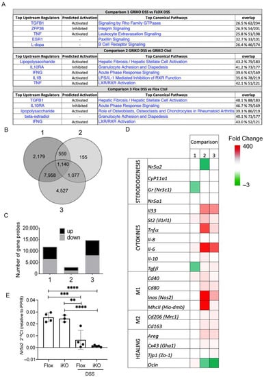 Epithelial GR modulates gene expression in intestinal mucosa from DSS-treated mice. (A) Top five upstream regulators and canonical pathways from gene expression microarray in GRiKO DSS vs. GRflox DSS (Comparison 1), GRiKO DSS vs. GRiKO Ctol (Comparison 2), and GRflox DSS vs. GRflox Ctol (Comparison 3) using Ingenuity Pathway Software (IPA); (B) Venn diagram of the overlap in significant gene probes determined from 3 comparisons; (C) Number of gene probes either induced (up) or repressed (down) by each comparison; (D) Gene probes that showed statistically significant differences for any of the three comparisons and that affected immune response and steroidogenesis pathway were selected and grouped into five categories: (1) steroidogenesis, (2) cytokines, (3) M1-like markers, (4) M2-like markers and (5) re-epithelialization. The heatmap indicates increased (red/upregulated) or decreased (green/downregulated) expression levels. Two-way ANOVA (p < 0.05); (E) Nr5a2 transcript (relative to Ppib) from colonic samples from each mice group. one-way ANOVA with Tukey’s post-test.** p < 0.01, *** p < 0.001, **** p < 0.0001.