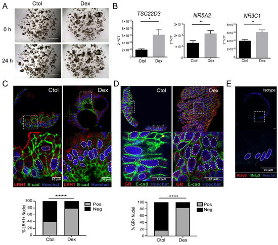 Dexamethasone induces LRH-1 in primary human intestinal organoids. Colonic organoids from healthy tissue were stimulated with 100 nM Dex for 24 h. (A) Organoids under light microscopy 4×. Scale bar 1000 μm. (B) Organoids were analyzed for TSC22D3 (left), NR5A2 (center) and NR3C1 (right) transcript levels, relative to 18s rRNA. Paired t-test, * p < 0.05; ** p < 0.01; n = 3. Representative immunoreactivity of (C) LRH-1 and (D) GR with corresponding (E) IgG isotype control in paraffin-embedded PFA-fixed sections of colonic organoids stimulated with 100 nM Dex for 24 h. Percentage of positive and negative nuclear staining for (C, bottom) LRH-1 and (D, bottom) GR. E-cadherin (E-cad, green) was used for epithelium counterstain and Hoescht as nuclear stain, **** p < 0.0001. In zoomed image: whole organoid for context purposes. Dashed line: positive nuclear stain; dotted line: negative nuclear stain. Objective 40×. Scale bar 20 μm.