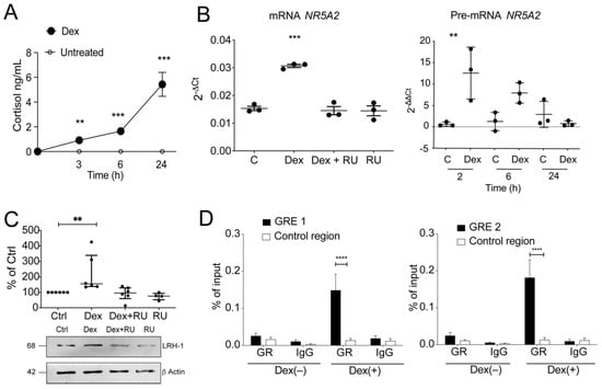 Confirming direct LRH-1/NR5A2 expression regulation by GR, the presence of GR binding to both GRE elements at the NR5A2 promoter in dexamethasone-treated cells was detected using chromatin immunoprecipitation assays (ChIP) (p < 0.0001). The GR enrichment at each NR5A2 GRE site was estimated using the GAPDH gene promoter as an internal control, with comparable GR levels to the negative control (IgG) in non-treated cells (Figure 6D).