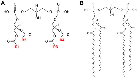 The structure of CL (A) and TLCL (B). CL has four fatty acyl chains designated R1–R4.