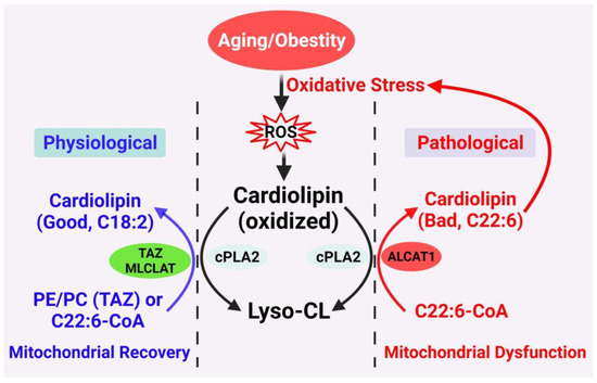 Proposed CL remodeling pathways in obesity and aging. Aging and obesity cause oxidative stress, leading to the production of ROS. CL oxidation by ROS triggers the remodeling of its fatty acyl chains, which begins with hydrolysis of oxidized CL by phospholipase A2 (cPLA2), followed by acylation of lysocardiolipin by either tafazzin (TAZ), MLCLAT, or ALCAT1. TAZ is a transacylase that catalyzes physiological remodeling of CL with other phospholipids, such as PC and PE, whereas MLCLAT catalyzes remodeling of CL with MLCL and linoleoyl-CoA, leading to mitochondrial recovery. ALCAT1 catalyzes remodeling of CL with both MLCL or dilysocardiolipin and docosahexaenoic-CoA (C22:6) as substrates, leading to CL peroxidation by ROS and mitochondrial dysfunction.