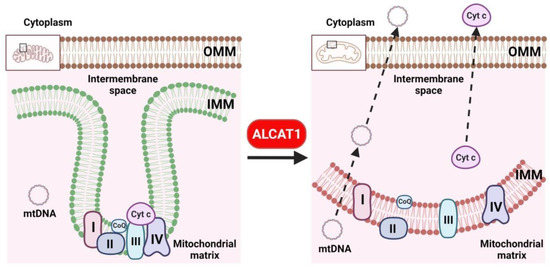 CL remodeling by ALCAT1 leads to a loss mitochondrial membrane curvature, oxidative stress, and defective oxidative phosphorylation. CL is required for the curvature of the inner mitochondrial membrane which plays critical role in supporting the function of mitochondrial respiration complexes. CL remodeling by ALCAT1 causes depletion of CL, leading to a loss of cisterna structure, oxidative stress, defective oxidative phosphorylation, and cytosolic release of mtDNA and cytochrome c.