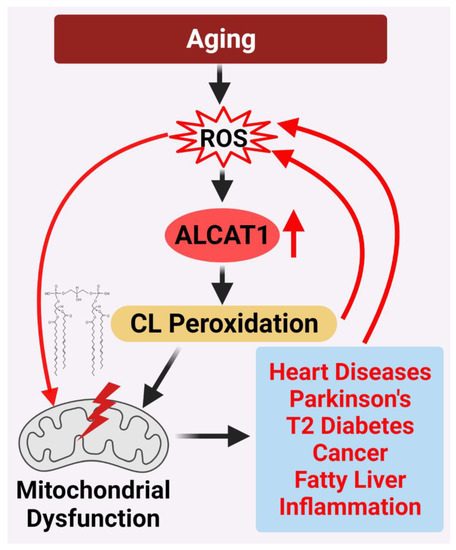 CL is a polyglycerophospholipid exclusively localized in the mitochondria, where it regulates membrane structure, oxidative phosphorylation, mtDNA biogenesis, fusion, fission, and mitophagy in eukaryotic cells [10,11,12,13,14]. This role is mediated in part by the acyl composition of its four side chains, which are dominated by linoleic acid in insulin-sensitive tissues [15,16,17,18]. This unique acyl composition is not derived from the de novo synthesis of CL but rather from a remodeling process that involves phospholipases and acyltransferases/transacylases [19,20,21]. This remodeling process is also believed to be responsible for generating CL species that are highly sensitive to oxidative damage by ROS, further exacerbating CL peroxidation and oxidative stress. In this review, we make the case that the pathological remodeling of CL by ALCAT1 in response to oxidative stress associated with aging and obesity is the missing link between mitochondrial dysfunction and the development of various age-related diseases. We will also review evidence that age-related disorders are one disease (aging) manifested by different mitochondrion-sensitive tissues, and therefore can potentially be treated as one disease in the future.