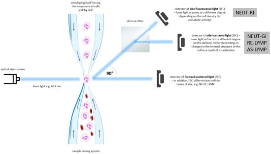 This study focuses on the evaluation of new hematological markers of inflammation-Extended Inflammation Parameters (EIP) in pemphigus. The evaluated parameters include NEUT-RI (Neutrophil Reactive Intensity, expressed in FI units, showing fluorescence intensity), NEUT-GI (Neutrophil Granularity Intensity, expressed in SI units, showing laser light scattering intensity), RE-LYMP (Reactive Lymphocytes, expressed as the number of cells per µL) and AS-LYMP (Antibody-Secreting Reactive Lymphocytes, expressed as the number of cells per µL) [12]. RE-LYMP parameter provides information on the amount of all reactive lymphocytes in peripheral blood. Lymphocyte populations are differentiated on the basis of their functionality and differences resulting from their functionality in internal structure, present granularity and size of the analysed cells which is accessible in SYSMEX XN haematological analysers. The neutrophil parameters, i.e., NEUT-RI and NEUT-GI inform about the stage of activation of neutrophil granulocytes. The measurement considers the metabolic activity of neutrophils, their internal structure and cell size [13]. EIP measurement method was shown in Figure 1.