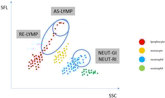 Reflecting the amount of reactive lymphocytes and neutrophils at different activation stages in the peripheral blood fraction. WDF scattergram showing the distribution of populations: lymphocytes (AS-LYMP population–upper marking and RE-LYMP population–lower marking), monocytes, neutrophils [the SSC signal of the neutrophil population, which is plotted on the x-axis of the scattergram, is an indicator of the granularity and internal structure of the cells (NEUT-GI) and the fluorescence intensity, which corresponds to the RNA/DNA content of the cells, is plotted on the y-axis and is an indicator of increased RNA activity (NEUT-RI)] as well as eosinophils and basophils. (AS-LYMP–Antibody-Secreting Reactive Lymphocytes, NEUT-GI–Neutrophil Granularity Intensity, NEUT-RI–Neutrophil Reactive Intensity, RE-LYMP–Reactive Lymphocytes).