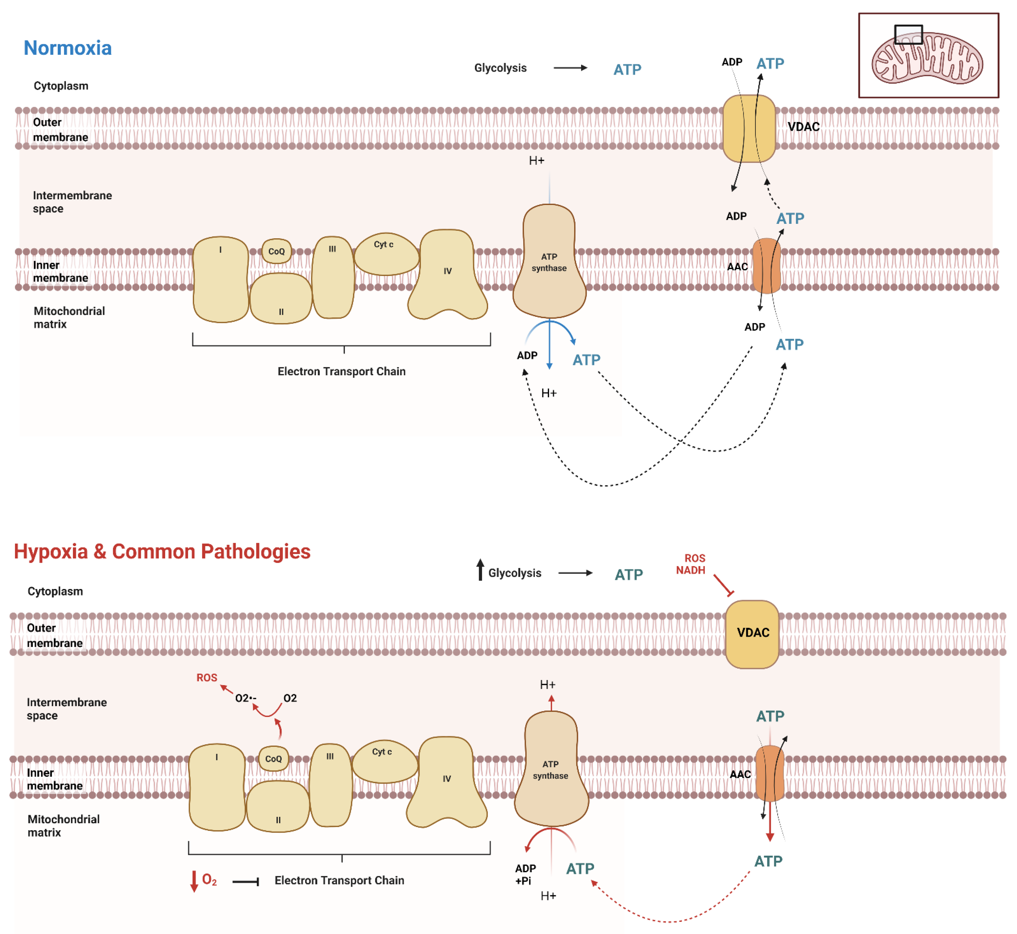 Figure 1. ATP movement between mitochondria and cytosol. Under normal conditions (normoxia), the cell has distinct cellular processes in which to transport ATP throughout the cell, both into and out of the mitochondrial matrix. The mitochondria produce the majority of ATP in normoxic conditions, while glycolysis produces a significantly lower amount. However, in the setting of hypoxia or similarly acting pathologies, there is an upregulation of glycolysis, as the decrease in oxygen causes a significant downregulation of electron transport chain function. This results in the reversal of AAC transport of ATP to inside the matrix, where it is then hydrolyzed by the also reversed rotation of ATP synthase.