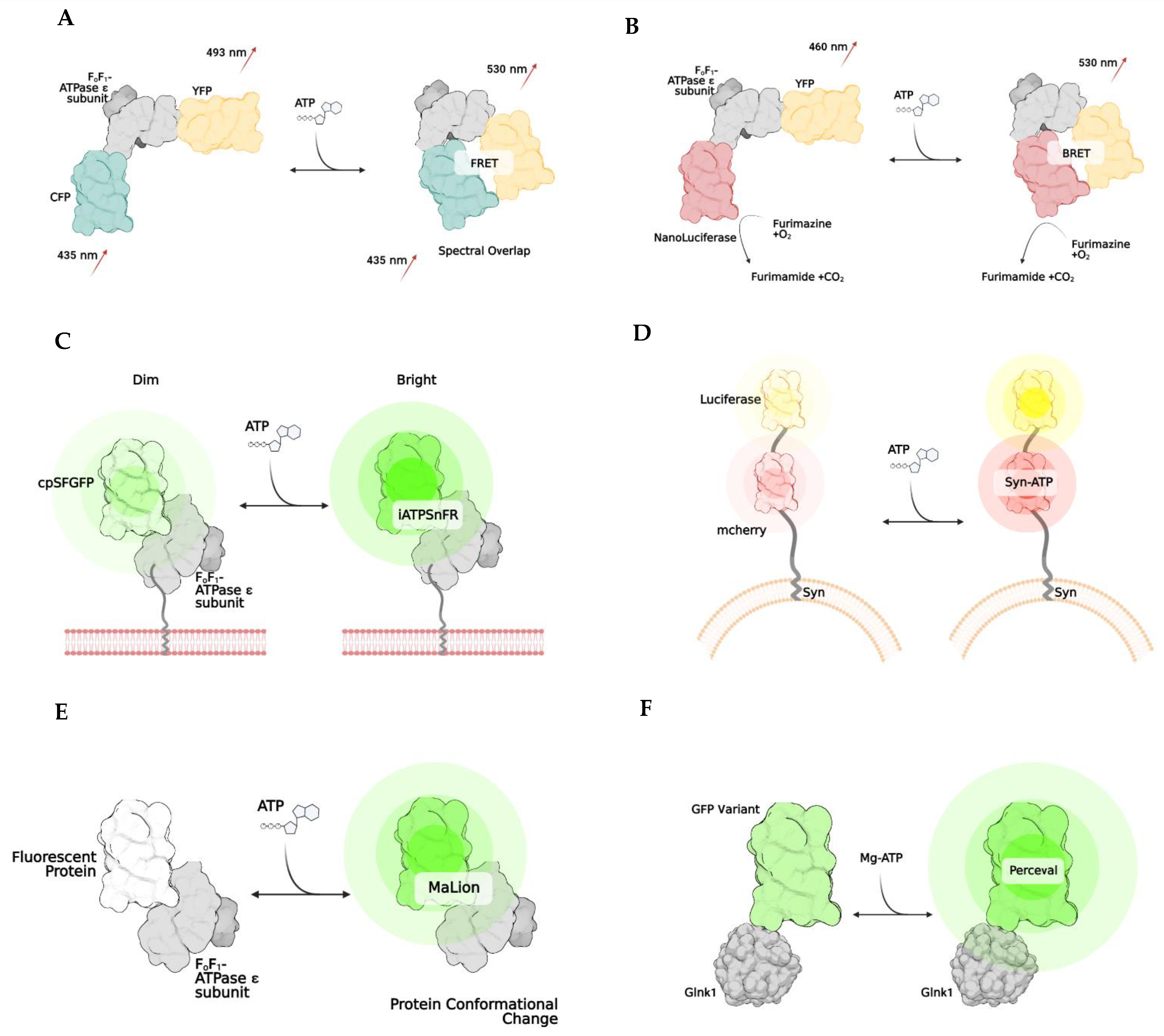Figure 2. Examples of genetically encoded biosensors. Förster resonance energy transfer, or FRET, (A) works by changing emission spectra after the binding of a substance (A). The result is due to the two fluorophores being brought closer together (<10 nm). Bioluminescent resonance energy transfer, BRET, works similarly to FRET, except NanoLuciferase becomes active once the substrate of interest is bound, resulting in a change of emission. (B) iATPSnFR is a unique biosensor, in which the ATPase subunit has a membrane-bound region, which allows it to be anchored to a cell’s surface. (C) Syn-ATP was designed to target synaptic nerve endings, as the synaptophysin protein anchors the biosensor to a synaptic vesicle membrane. Once ATP is bound, the mCherry and Luciferase enzymes provide a fluorescent/luminescent ratio for analysis. (D) MaLions are intensiometric biosensors, fluorescing brighter as more ATP is bound. These are unique as multiple biosenors have been designed in this family to target specific cellular organelles, making the ATP levels visible across multiple compartments. (E) Lastly, perceval is a ratiometic indicator that indicates its ATP level based on the ratio of ADP to ATP (F).