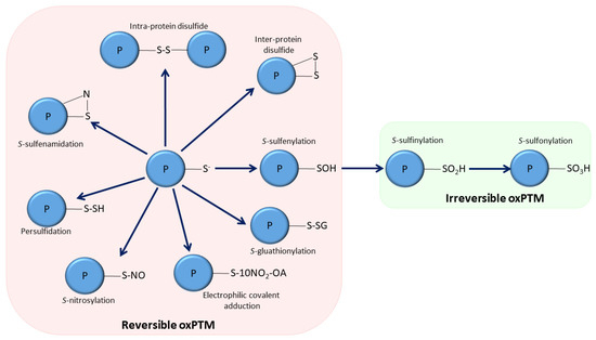 Summary of the oxPTMs formed in protein thiols. Thiolate anions can react with a variety of reactive oxygen or nitrogen species to form reversible (intra-protein disulfides, inter-protein disulfides, S-sulfenylation, S-nitrosylation, S-glutathionylation, persulfidation, S-sulfenamidation, electrophilic covalent adduction) and irreversible hyper-oxidized (S-sulfinylation, S-sulfonylation) redox states.