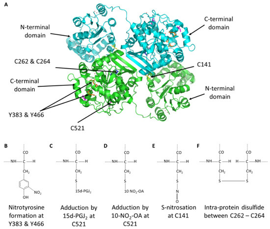 Tyrosine residues can be oxidized to dityrosine and can also react with peroxynitrite to form 3-nitrotyrosine [2], which can mimic regulatory tyrosine phosphorylation [3]. Methionine residues are reversibly oxidized to methionine sulfoxide, and then further irreversibly oxidized to the sulfone [4]. The thiol groups in cysteine residues are especially sensitive to oxidation. Depending on the species and concentration of the oxidant, cysteine thiols can undergo a variety of different oxidative modifications. For example, cysteine thiols can undergo persulfidation (also known as S-sulfhydration), S-nitrosylation, S-sulfenylation or S-glutathionylation, following reactions with hydrogen sulfide, reactive derivatives of nitric oxide (so called NOx species), hydrogen peroxide or derivatives of glutathione (e.g., GSSG, GSNO), respectively [5,6,7]. Other, more stable oxidation states that cysteine residues can form include inter-protein and intra-protein disulfide bonds, as well as over oxidation reactions to sulfinic and sulfonic acids [5,6], as shown in Figure 1. Electrophilic lipids, such as 15-deoxy-Δ-prostaglandin (15d-PGJ2) and 10-nitro-oleic acid (10-NO2-OA), which we discuss in detail below, can also covalently adduct to cysteine thiols via a Michael addition reaction [8].