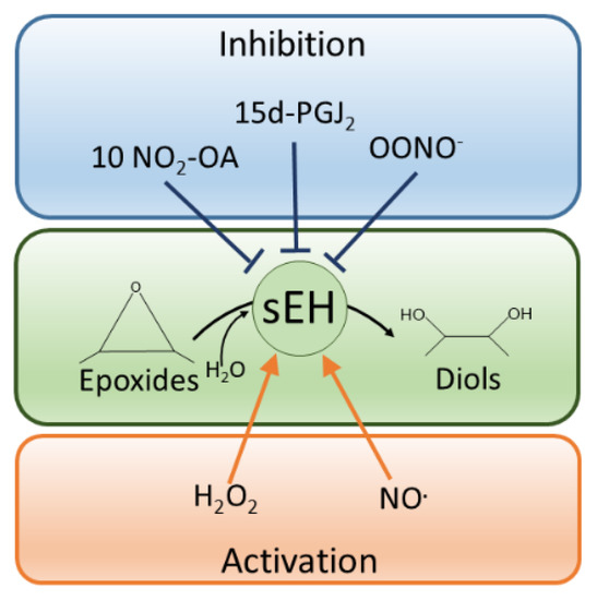 sEH activity is regulated by diverse redox mechanisms. Different reactive oxygen species or reactive nitrogen species can differentially modify sEH to alter its activity. For example, the lipid electrophiles 10-NO2-OA and 15d-PGJ2 as well as peroxynitrite inhibit the hydrolase, whereas hydrogen peroxide or NO stimulate it.