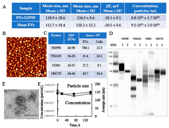 EVs were collected from GDNF-transfected macrophage media, and the size and number of particles were evaluated using NanoSight 500, Version 2.2 (Wiltshire, UK). In addition, the concentration, and zeta potential (ZP) of the EVs were measured using a ZetaView QUATT Nanoparticle Tracking Microscope PMX-420 (Particle Metrix, Inning am Ammersee, Germany). For this purpose, the EVs were diluted to a concentration of about 2 × 107 particles/mL, with 20 nm of filtered PBS. Measurements were performed at 11 positions using the following settings: maximum area 1000, minimum area 5, minimum brightness 20, camera level 16, and threshold level 5. Total protein was calculated using standard BCA assay. The AFM imaging was performed as described earlier []. A drop of isolated EVs in 50 mM phosphate buffer, pH 7.4, at total protein 10 µg/mL was placed on a glass slide and dried under an argon flow. For TEM imaging, EVs were adsorbed onto Formvar coated copper grid (400 mesh), stained with 2% uranyl acetate for 1 min. The samples were observed using a JEOL JEM-1230 transmission electron microscope operating at 80 kV (JEOL USA INC., Peabody, MA, USA) and images were taken using a Gatan Orius SC1000 CCD camera with Gatan Microscopy Suite version 3.10.1002.0 software (Gatan, Inc., Pleasanton, CA, USA).
