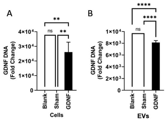 Characterization of genetic content of GDNF-transfected parent macrophages and released EV-GDNF by quantitative qPCR. Macrophages were transfected with GDNF-encoding pDNA by electroporation, and the levels of GDNF-DNA in the cells (A) and EVs released by these cells (B) were assessed. A significant amount of GDNF-DNA was detected in parent cells, as well as in the EVs. Statistical significance was assessed by one-way ANOVA corrected for multiple comparisons using the FDR. ** p < 0.01, or **** p < 0.0001.