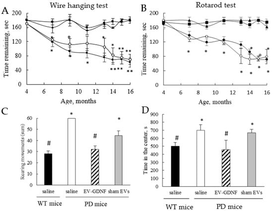 Behavioral tests demonstrating significant therapeutic effect of EV-GDNF in Parkin-Q311X(A) mice. The effect of EV-GDNF on motor functions and activity was assessed in a wire-hanging test and rotarod test (A,B), as well as in OFA tests (C,D). (A,B) Transgenic mice were i.n. injected with EV-GDNF (triangles, 3 × 109 particles/10 µL/mouse), or sham EVs (empty circles, 3 × 109 particles/10 µL/mouse), or saline (filled circles, 10 µL/mouse). Wild-type mice i.n. injected with saline (filled squares, 10 µL/mouse) were used as controls. Wire-hanging test (A), and rotarod test (B) demonstrated significant improvements in motor functions upon treatment with EV-GDNF. (C,D) OFA tests at 12 mo demonstrated improved behavior in EV-GDNF-treated PD mice (striped bars) compared to PD mice treated with saline (white bars), which was similar to healthy WT mice (black bars), including decreases in hyperactivity and anxiety-like behaviors. The differences between sham EVs and saline in PD mice were inconclusive. Values are means ± SEM (n = 10), * p < 0.05, ** p < 0.005, and # p< 0.05, as compared to WT control mice injected with saline.