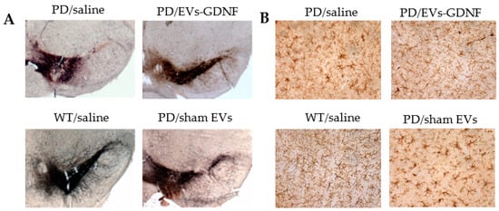 At the endpoint, the 16-month-old animals were sacrificed and perfused. Postmortem brains were harvested, washed, and postfixed, and immunohistochemical analysis was performed in 30 µm-thick, consecutive, coronal brain sections. Two methods of sectioning the tissues were utilized. For investigations of the effect of EV-formulations on the protection of dopaminergic neurons, as well as decreases in microglial activation, the free-floating sections of the tissues were used. This approach allows the viewing of the structure of the dendrites and axons throughout the sample. The sections were not mounted on slides until after the completion of the immunohistochemistry process. To examine the neuroprotective effects of EV-based formulations, dopaminergic neurons were visualized with tyrosine hydroxylase staining as described in []. To study the microglial activation in the brains of the treated animals, primary monoclonal rat anti-mouse Mac1 antibodies (AbD Serotec, Raleigh, NC, USA) were used, along with secondary biotinylated goat anti-rat antibodies (Vector Laboratories, Burlingame, CA, USA). Each midbrain section was viewed at low power (10× objective), and the SNpc was outlined [].