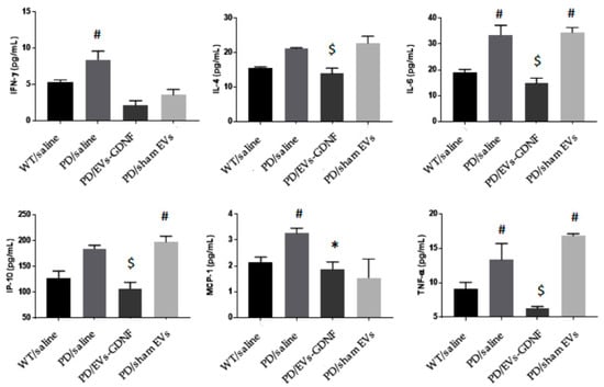 Furthermore, the anti-inflammatory effects of the EV-GDNF treatments were confirmed by measuring the levels of pro-inflammatory cytokines and chemokines in main organs of the animals (Figure 5). Significant (#) secretion of IFN-γ, IL-6, MCP-1, and TNF-α were identified in the brains of PD mice injected with saline, and of IL-6, IP-10, and TNF-α in sham EVs, when compared to healthy controls. In contrast, PD mice treated with EV-GDNF showed a significant decrease (*) in secretion of IFN-γ and MCP-1 when compared to PD mice treated with saline, and a significant decrease ($) in IL-4, IL-6, IP-10, and TNF-α, when compared to PD mice treated with saline and sham EVs, similar to WT mice, or even lower. This confirms that EVs loaded with GDNF could diminish inflammation in the brains of PD mice.