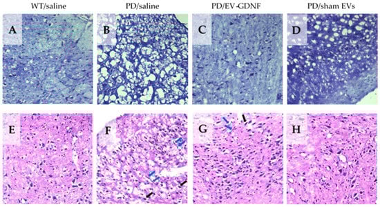 Histological analysis of neuroprotective effects of EV-GDNF in Parkin Q311(X)A mice. Transgenic mice (4 mo old) were intranasally injected with: saline (10 µL/mouse), (3) EV-GDNF (3 × 109 particles/10 µL/mouse), or sham EVs (3 × 109 particles/10 µL/mouse). Wild-type control mice were intranasally injected with saline (10 µL/mouse). Animals were sacrificed at month 16, and brain slides were stained with Nissl staining (A–D) or H&E staining (E–H). The obtained bright-light images show lower numbers of Nissl bodies with neuronal shrinkage (B) and damaged tissues with degeneration in the neurons (F) in PD mice treated with saline when compared to WT mice (A,E). Histological analysis indicates neuroprotective effects in the brain of PD mice treated with EV-GDNF with healthy morphology in tissue structure and high integrity of neurons (C,G) when comparted to PD mice treated with saline (B,F). The administration of sham EVs did not have a significant therapeutic effect in PD mice (D,H). Black arrows, degenerated neurons; blue arrows, elongated irregular nuclear morphology.