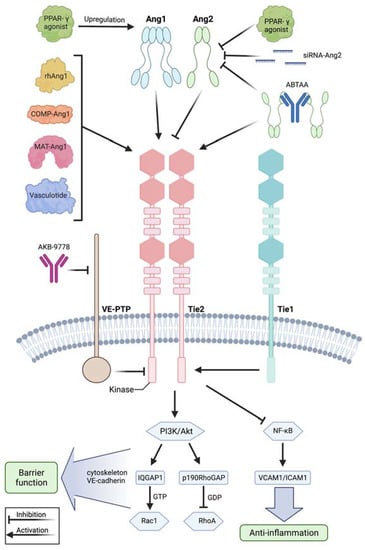 Modulation of the angiopoietin-Tie2 signaling axis during systemic inflammation. Recombinant human angiopoietin 1 (rhAng1), cartilage oligomeric matrix protein (COMP)-angiopoietin 1 (COMP-Ang1), matrilin-1-angiopoietin-1 (MAT-Ang1) and vasculotide are Tie2 agonists with similar action to angiopoietin 1, while peroxisome proliferator–activated receptor-γ (PPAR-γ) agonists upregulate angiopoietin 1 bioavailability. Small interfering RNA (siRNA) against angiopoietin 2 and PPAR-γ agonists reduce angiopoietin 2 expression. AKB-9778 is an antibody directed against vascular endothelial protein tyrosine phosphatase (VE-PTP) and thus indirectly activates Tie2. ABTAA is a novel ANG2-binding and Tie2-activating antibody combining the features of angiopoietin 2 inhibition and Tie2 activation. Tie1 further modulates response at the Tie2 receptor as endothelial cells shed the Tie1 ectodomain leading to Ang2 binding, resulting in Tie2 antagonism and reducing the agonistic activity of Ang1 during inflammation. Mechanistically, these treatment strategies lead to Tie2 receptor agonism, resulting in enhanced vascular barrier function by the PI3K/Akt signaling cascade and anti-inflammation by suppression of transcription factor NF-κB and, thus, of intercellular adhesion molecule (I-CAM) and vascular cell adhesion molecule (V-CAM). Downstream of phosphatidylinositol-3-kinase/protein kinase B (PI3/Akt) activation, there is the GTPase-activating protein 1 (IQGAP1), which activates Rac1 by stabilizing it in its active GTP-bound form, whereas Rho GTPase-activating protein p190RhoGAP converts RhoA into its inactive state. These steps promote an increase in cortical actin that strengthens the cytoskeleton and thus the vascular barrier function, whereas Tie2 activation additionally results in inhibition of Src kinase preventing the phosphorylation and internalization of vascular endothelial-cadherin (VE-cadherin). This figure was created with BioRender.com and adapted from Pariksh SM et al., J Am Soc Nephr 2017 and Wettschureck et al., Physiol Rev 2019 [,].