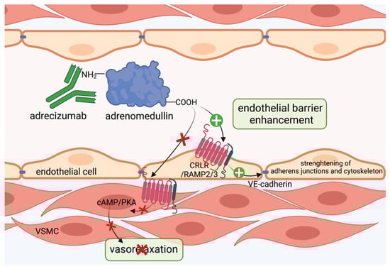 In preclinical animal models, infusion of adrenomedullin preserved hemodynamics, reduced vascular hyperpermeability and increased sepsis survival [,,]. However, there have been issues hampering the transfer to bedside of adrenomedullin in sepsis. First, systemic administration in higher doses exerts vasodilatory properties, which are detrimental in patients already suffering from severe hypotension in septic shock []. Second, adrenomedullin exhibits a short half-life [,] and adheres to artificial surfaces used in the clinic [], suggesting an inconvenient applicability in treatment of septic patients. Adrenomedullin binds to the CRLR/RAMP complex via its C-terminus [,]. While complete inhibition of adrenomedullin binding to its receptor did not improve survival in septic mice, treatment with antibodies against the N-terminus of adrenomedullin strongly reduced mortality in mice after sepsis induction by only partial inhibition of adrenomedullin [,]. Further, antagonizing the N-terminal side of adrenomedullin with the antibody HAM1101 improved responsiveness to vasopressors and kidney function in murine sepsis []. Subsequently, HAM1101 was humanized to HAM8101, named adrecizumab and introduced by Geven et al. []. In their studies, pretreatment of rodents with adrecizumab during endotoxin exposure, as well as upon cecal ligation and puncture mimicking sepsis, lead to decreased albumin extravasation into renal tissue, indicating a preserved vascular barrier function and increased murine survival []. Interestingly, angiopoietin 1 levels were also augmented in the group treated with adrecizumab []. Mechanistically, adrecizumab is a non-blocking monoclonal antibody that binds to the N-terminal side of adrenomedullin and increases its half-life by protecting the N-terminus, where proteolytic degradation occurs and further modulates the equilibrium of adrenomedullin between the blood compartment and interstitium [] (Figure 3). Given that adrecizumab is a large IgG antibody of 160 kDa, it does not freely diffuse from the circulation into tissues, suggesting that adrecizumab keeps adrenomedullin within circulation. Here, it protects endothelial barrier function, while the vasodilating effect of adrenomedullin on VSMCs can be diminished []. In the phase 2 AdrenOSS-2 trial, 300 patients with elevated adrenomedullin (>70 pg/mL) received either adrecizumab or placebo. In this trial, adrecizumab was safe, well tolerated and lead to improvement in organ function and further reduced mortality at day 28 from 28% to 24% []. Next, a phase 2b/3 trial, ENCOURAGE, is planned with separate trials for sepsis and septic shock []. Conceivably, adrecizumab may display a novel promising approach in biomarker-guided sepsis treatment.