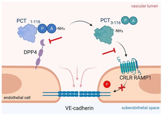 Like adrenomedullin, procalcitonin (PCT) belongs to the calcitonin peptide family [] and is used as an early and predictive sepsis biomarker. In 1993, Assicot and colleagues first described procalcitonin levels to be increased in patients with systemic bacterial infection []. Nowadays, procalcitonin can contribute to clinical decision making in septic patients and guide anti-infective therapy in sepsis [,,,,]. Furthermore, procalcitonin aids in the therapeutic decision to discontinue antimicrobial therapy as levels decrease when infection is successfully treated [,]. In healthy subjects, procalcitonin production by the CALC-I gene is limited to the thyroid C cells and pulmonary neuroendocrine cells, keeping procalcitonin levels to the low picogram range, whereas systemic inflammation induces a ubiquitous expression of procalcitonin in multiple tissues []. To date, the exact mechanism of the procalcitonin burst during sepsis remains insufficiently understood, but it is assumed that monocytes adherent to the activated endothelium secrete procalcitonin and further promote its production by various parenchymal cells, such as adipocytes []. In preclinical animal models, procalcitonin administration decreased survival, whereas procalcitonin neutralization using antibodies as well as knocking-out procalcitonin production in mice lacking the CALC-I gene augmented macrohemodynamics and significantly decreased mortality, indicating that procalcitonin itself may play a role in sepsis pathophysiology [,,,,]. Further, evidence from our research group suggests that procalcitonin directly impairs endothelial cell function and causes cytotoxicity [,]. In septic patients’ plasma, procalcitonin exists in two forms, a full-length, 116-amino-acid-long peptide and a 114-amino-acid truncated variant [,]. Enzymatic cleavage is facilitated by dipeptidyl peptidase 4 (DPP4) via N-terminal removal of the two amino acids alanine and proline []. Procalcitonin exerts actions on the CGRP receptor, which is a heterodimer formed by CRLR/RAMP1 [,,]. Interestingly, elevated procalcitonin levels after major surgery are also indicative for organ dysfunction [,]. Recently, data from our research group showed that elevated procalcitonin levels after cardiopulmonary bypass surgery identifies patients with signs of postoperative capillary leakage and increased requirements for fluids and vasopressors, and suggest an impairment of microvascular integrity []. We identified that procalcitonin levels of 10 ng/ml, typically observed in septic patients [], induce severe pulmonary edema formation in healthy wild type mice. Mechanistically, procalcitonin was shown to induce Src-dependent phosphorylation of VE-cadherin at tyrosine 685 and dissociation of adaptor protein p120 from VE-cadherin in endothelial cells (Figure 4). We further verified these findings in vivo, dissecting that mice expressing a non-phosphorylatable Y685F mutant of VE-cadherin were protected against procalcitonin’s edema-inducing effects. We further elaborated that only the truncated 114-amino-acid variant of procalcitonin induces endothelial permeability, whereas inhibition of procalcitonin activation from its longer 116-amino-acid variant protected from capillary leakage. The identification of a direct modulatory role on the endothelial barrier may thus render procalcitonin a novel therapeutic target during systemic inflammation from bacterial infection.