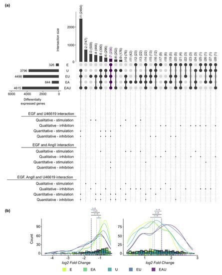 The genes comprised of the intersections of the UpSet plot (Figure 4a) were thus screened with this method. We selected genes that showed a significant difference (p < 0.05) when comparing the single incubations to the corresponding double one (e.g., comparing EGF vs. EGF and U46619 and comparing U46619 vs. EGF and U46619) for at least one time point. Genes comprised of intersections associated with clear qualitative synergism or that did not comprise DEG regulated by the concerned conditions were filtered out.
