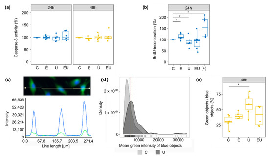 Caspase-3 served as an indicator for cell death and more, especially apoptosis. However, incubation with EGF or/and U46619 for 24 or 48 h did not lead to any significant change in its activity (Figure 5a).