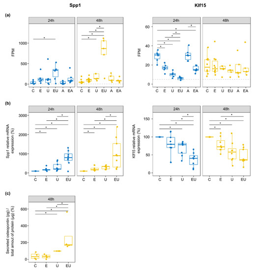 On the contrary, Spp1 was continuously (lasting effect, intersection i17 in Figure 4a) and strongly up-regulated by the combination of EGF and U46619 in the RNA-sequencing data (log2-fold change = 2.89 and 3.61 after 24 and 48 h, respectively). qPCR confirmed the severe up-regulation by EGF and U46619 (10-fold increase in comparison to the control group) at the mRNA level (Figure 6b). Additionally, ELISA measurement confirmed that EGF and U46619 also triggered a strong up-regulation (7-fold increase) of the secreted OPN (Figure 6c).