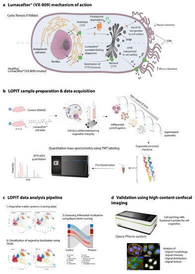 LOPIT-DC workflow applied to F508del-CFTR CFBE41o- cells. (a) Mechanism of action of Lumacaftor (VX-809), a drug used to promote the folding and trafficking of F508del-CFTR to the PM. (b) Schematic of LOPIT sample and data acquisition. After incubation with either VX-809 or control DMSO, cells were lysed and organelles separated by differential centrifugation into 10 fractions. Following tryptic digestion, the peptide content of each fraction was then labelled with a different isobaric tag (TMT), and fractions pooled together and analyzed by nanoLC-MS/MS. In each peptide MS/MS spectrum, the relative intensity of the TMT reporter ions is associated with the abundance of the corresponding protein in each fraction. (c) LOPIT data analysis pipeline. Based on the data from markers of known subcellular localization using multivariate data analysis, the spatial map of the CFBE41o- proteome was produced for each condition. Using SVM classification and Bayes factor scoring, changes in the subcellular localization of proteins following VX-809 treatment are assessed. (d) Validation of LOPIT-DC hits using high-content confocal imaging.