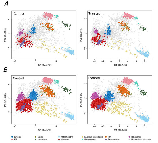 - Geladaki, A.; Britovšek, N.K.; Breckels, L.M.; Smith, T.S.; Vennard, O.L.; Mulvey, C.M.; Crook, O.M.; Gatto, L.; Lilley, K.S. Combining LOPIT with differential ultracentrifugation for high-resolution spatial proteomics. Nat. Commun. 2019, 10, 331. [Google Scholar] [CrossRef] [Green Version]