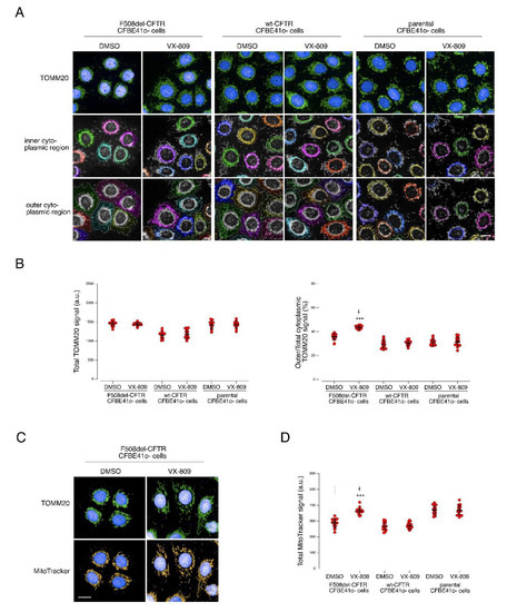 Analysis of mitochondrial network morphology in parental, F508del-CFTR or wt-CFTR CFBE41o- cells under control conditions and following treatment with VX-809. (A) Microphotographs showing mitochondrial network in cells treated either with vehicle alone (DMSO) or with VX-809 (3 µM). Mitochondria were visualized by staining for the mitochondrial marker TOMM20 using a mouse anti-TOMM20 as primary antibody followed by an anti-mouse secondary antibody conjugated to AlexaFluor 488. Cell nuclei were counterstained with Hoechst 33342. Cytoplasm was divided into inner (middle panels) and outer (bottom panels) cytoplasmic regions. (B) Quantification of total TOMM20 signal intensity (left graph) and percentage of TOMM20 signal localized in the outer cytoplasmic region (right graph) in cells under resting condition (DMSO-treated cells) or treated with VX-809 (3 µM). Each dot represents the value obtained from the analysis of a different biological replicate, in which 1000 cells were imaged and analyzed. Scale bar = 25 µm. Lines indicate means ± SD, n = 16. Statistical significance of VX-809 treatment was tested using a Student’s t-test. Symbols indicate statistical significance versus DMSO: *** p < 0.001. Only statistically significant comparisons are reported. (C) Representative microphotographs showing mitochondria in F508del-CFTR CFBE41o- cells treated with vehicle alone (DMSO) or VX-809 (3 µM). Mitochondria were visualized by staining for the mitochondrial marker TOMM20 as detailed in (A) or by means of the fluorescent dye MitoTracker, which accumulates in viable mitochondria-dependent on mitochondria membrane potential. Cell nuclei were counterstained with Hoechst 33342. (D) Quantification of total MitoTracker signal (corresponding to the dye accumulated into mitochondria) in parental, F508del-CFTR or wt-CFTR CFBE41o- cells treated with DMSO vs. VX-809. Each dot represents the value obtained from the analysis of a different biological replicate, in which 750 cells were imaged and analyzed. Scale bar = 25 µm. Lines indicate means ± SD, n = 16. Statistical significance of VX-809 treatment was tested using a Student’s t-test. Symbols indicate statistical significance versus DMSO: *** p < 0.001. Only statistically significant comparisons are reported.