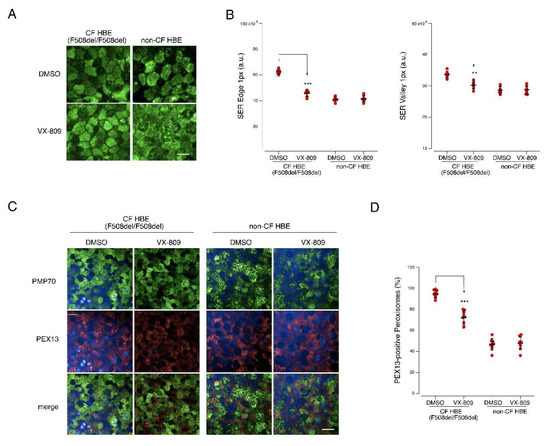 As a further step, we aimed to validate our findings by translating these results to primary bronchial cells, obtained from F508del/F508del CF subjects. Well-differentiated bronchial epithelia from two F508del/F508del CF patients and, for comparison, from two non-CF subjects were grown under air–liquid interface for 20 days, and then treated for 24 h with DMSO alone or with VX-809 (3 µM). Epithelia were subsequently fixed and stained for the mitochondrial marker TOMM20 (Figure 7A) or the peroxisomal markers PMP-70 and PEX13 (Figure 7C). Differences in the mitochondrial network were investigated by performing TOMM20 signal texture analysis. As calculated by SER (Spots, Edges, Ridges; see Methods) features, TOMM20 signal was significantly different in CF, with the presence of very dense or scattered regions, vs. non-CF epithelial cells, having a more uniform texture (Figure 7B). Compared to DMSO alone, the treatment with VX-809 altered TOMM20 signal only in F508del epithelia, with a decrease in signal irregularities, with SER features values more similar to those of non-CF epithelia (Figure 7B). We then investigated peroxisomal distribution in epithelial cells by comparing PMP-70 and PEX13 staining (Figure 7C). Interestingly, while the percentage of PEX13-positive peroxisomes was approximately 50% in non-CF epithelia (either DMSO- or VX-809-treated), we observed concomitant PMP-70 and PEX13 staining in >90% of the peroxisomes in CF epithelia. Treatment with VX-809 markedly decreases the percentage of PEX13 peroxisomes to approximately 70–75% compared to DMSO (Figure 7D).