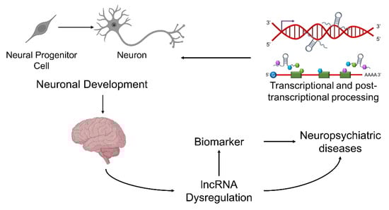 Greater than 98% of the human genome contains non-coding sequences, which is largely transcribed to produce numerous non-coding RNAs, which include microRNAs and long non-coding RNAs (lncRNAs) [1,2]. lncRNAs, which harbor more than 200 nucleotides in length but do not encode proteins, have attracted increasing attention due to their function in normal brain development and their potential involvement in neuropsychiatric diseases. lncRNAs play multifaceted roles in gene regulation through nuclear domain organization, chromatin modulation, transcriptional regulation, governing RNA-binding protein localization and activity, as well as the regulation of mRNA translation and stability [3,4,5,6,7]. Despite discoveries of genetic mutations and the abnormal expression of lncRNAs in various mental illnesses [8,9,10,11], the connection of lncRNA mutation and dysregulation to the downstream molecular network underlying the pathophysiology of brain diseases is a major knowledge gap.