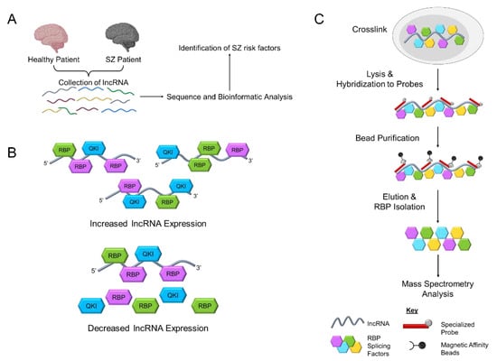 Another major challenge is elucidating the molecular mechanisms that underlie the multifaceted function of lncRNAs. While multiple lines of evidence suggest a role for GOMAFU in organizing subnuclear domain distribution of RBPs and regulating alternative splicing of SZ risk factor gene transcripts, the number of studies investigating lncRNA−RBP interactions in relation to SZ is very limited [131,132,136,139,146]. Recent advancements in method development have led to several new ways to identify lncRNA−RBP interactomes. Comprehensive identification of RNA-binding proteins (ChIRP) and capture hybridization analysis of RNA targets (CHART) are two newly developed methods for in silico identification of lncRNA-interacting RBPs without prior knowledge of the lncRNA-associated RBPs [179,180,181,182,183,184] (Figure 3C). These two methods provide a new avenue for studies to not only reveal novel RBPs that interact with lncRNAs, but also provide a method for determining how alterations in lncRNAs can influence RBP localization and activity. Specifically, identification of the GOMAFU−RBP interactome may provide critical clues into how GOMAFU dysregulation may affect RBP networks and the dynamic landscape of alternative splicing, which is a crucial factor in normal neuronal development and the pathogenesis of SZ.
