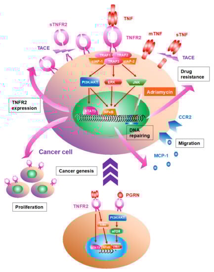 Upregulated TNFR2 signaling in colonic epithelial cells leads to colitis-associated carcinogenesis [83]. TNFR2-induced activation of transcription factor-associated protein induced the malignant transformation of hepatic progenitor cells and liver tumorigenesis, and the recurrence of hepatocellular carcinoma via STAT3 activation [47,85]. Other studies reveal another mechanism using murine brain cancer models: activated mammalian target of rapamycin (mTOR) signaling pathway followed by PGRN binding to TNFR2 was identified in malignant cervical cancer cells, whereas the inhibition of mTOR suppressed malignant transformation and tumor growth [38]. He and colleagues reported the tumorigenesis by the loss of TNFR2 allele using a murine breast cancer model [86]. These studies suggest that the TNFR signaling pathway may promote oncogenesis.