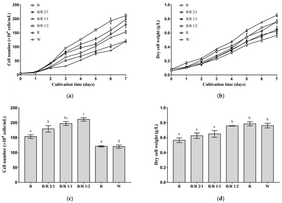 During cultivation, samples were taken regularly every day. Cell concentration or number (cells/mL) was counted with a hemocytometer (Paul Marienfeld GmbH & Co., KG, Lauda-Königshofen, Germany) under a microscope (CX31, OLYMPUS Corporation, Tokyo, Japan). For determination of dry cell weight (g/L), a fixed volume (V) of cell cultures was filtered onto a pre-weighed (W1) 1.2-μm glass microfiber filter (Whatman International Ltd., Maidstone, UK), which was then placed in an oven set at 105 °C overnight. After being cooled in a dryer, the filter was weighed (W2). Then, the dry cell weight of microalgae was calculated as (W2 − W1)/V.