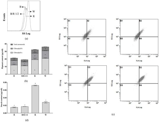 20]. In the present study, the fast-dividing cells obtained under mixed blue/red light or blue light exhibited smaller size, lower dry weight per cell, lower photosynthetic pigment content per cell, lower starch content per cell and lower intracellular granularity than those slowly dividing cells cultivated under the red and white lights. One possible explanation for such a phenomenon is that cell division is an energy-demanding process and can consume the majority of the cell’s energy reservoir [