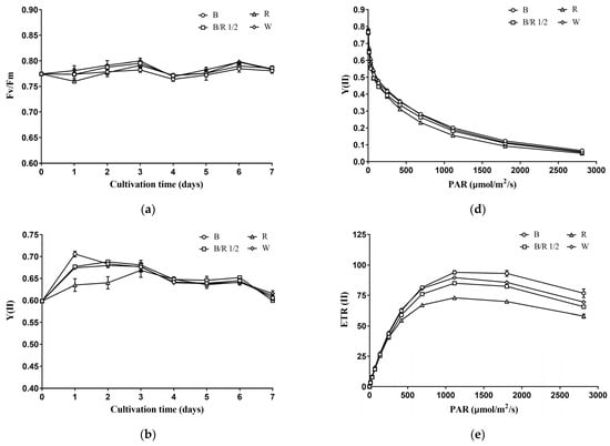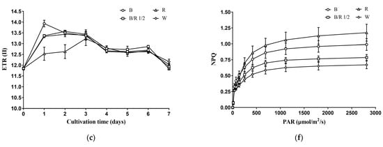 H. pluvialis cells cultivated under blue light became higher than those cultivated under white light and blue/red light 1/2, and the latter values were higher than that cultivated under red light. Using the Eilers–Peeters (EP) model to fit the light response curves in