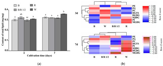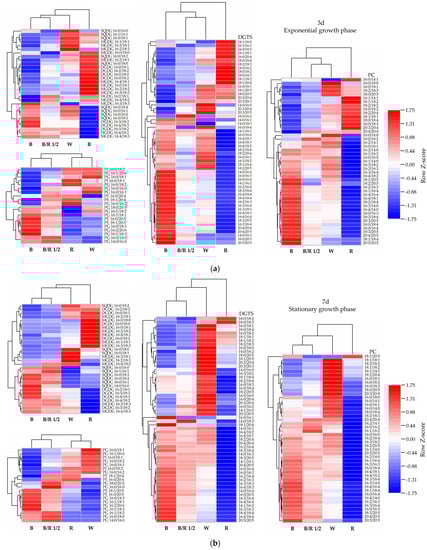 Figure 5b). In the stationary phase, notably, the contents of many lipid classes including DGDG, SQDG, DGTS, PC and PI in the white light group became higher than those in the other light condition groups, respectively. The blue/red light 1/2 group was also characterized by higher content of PE than the other groups. The content of MGDG remained the highest in the red light group among the four groups. Under blue light, the content of PG in